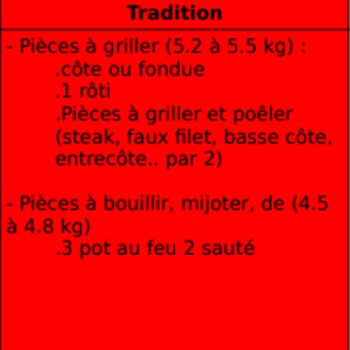 Viande bovine Race PARTHENAISE Dans ce colis Tradition de 10 kg environ, vous trouverez les différentes pièces de viande suivantes (la répartition pouvant varier selon l’animal) :